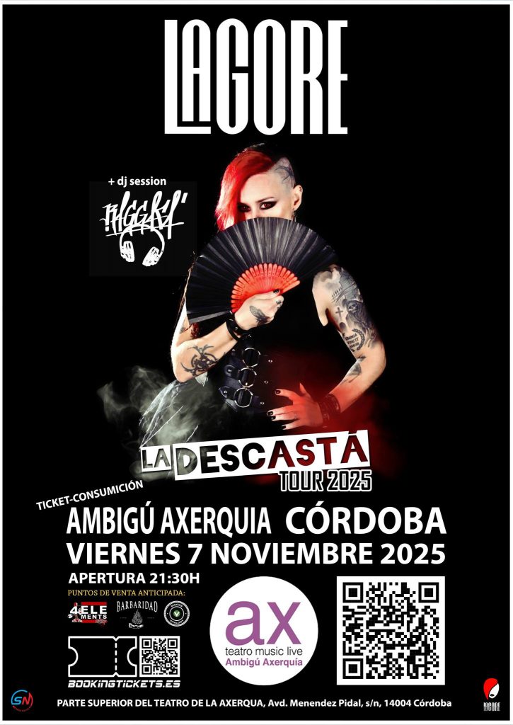 LA GORE llega a Córdoba con su estilo provocador impregnado de «macarreo», genio, actitud punk, estética gótica, «quejío» flamenco, y todo acompasado de electrónica, sintes old school y new school, que hacen vibrar a los más escépticos.